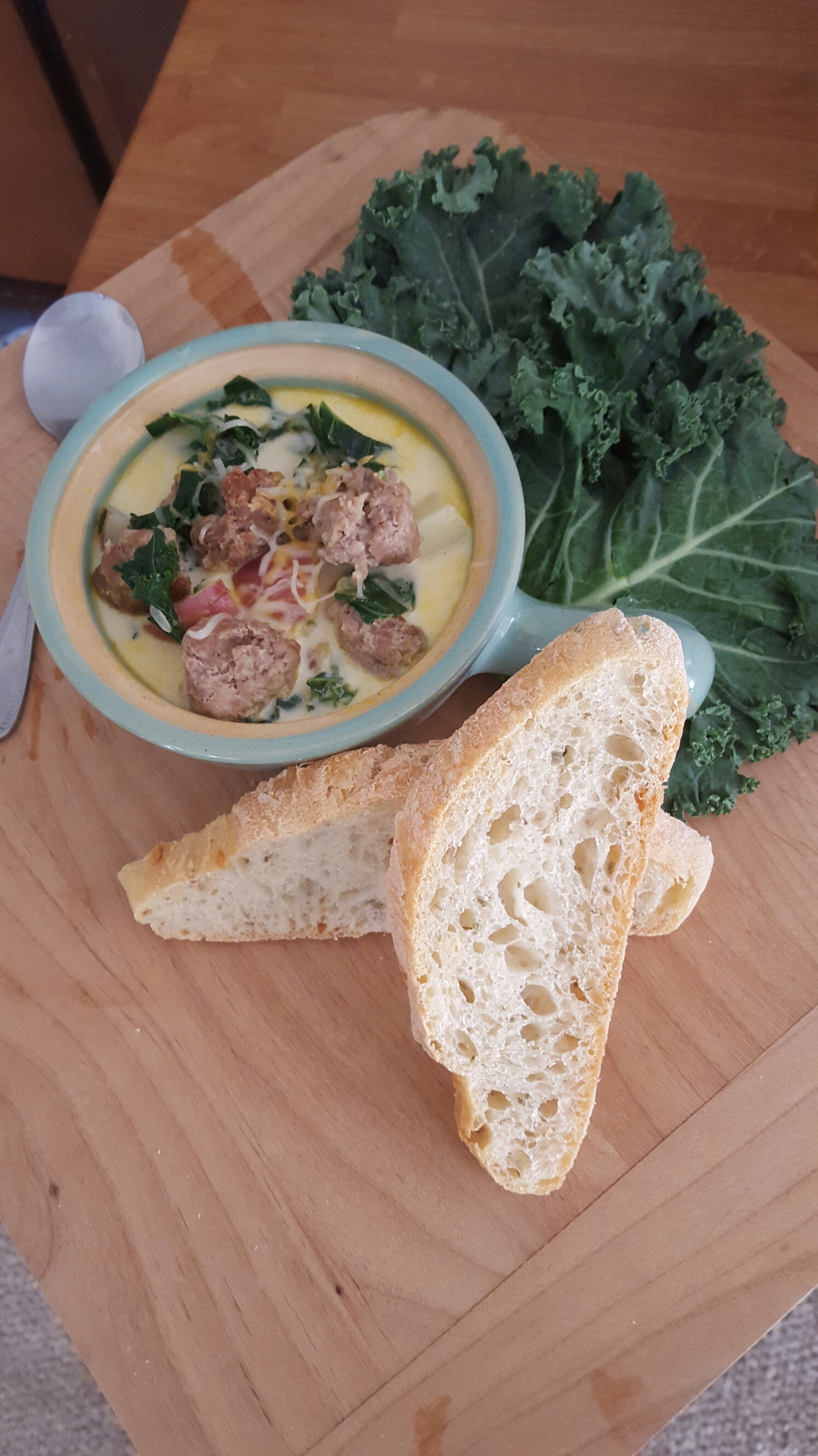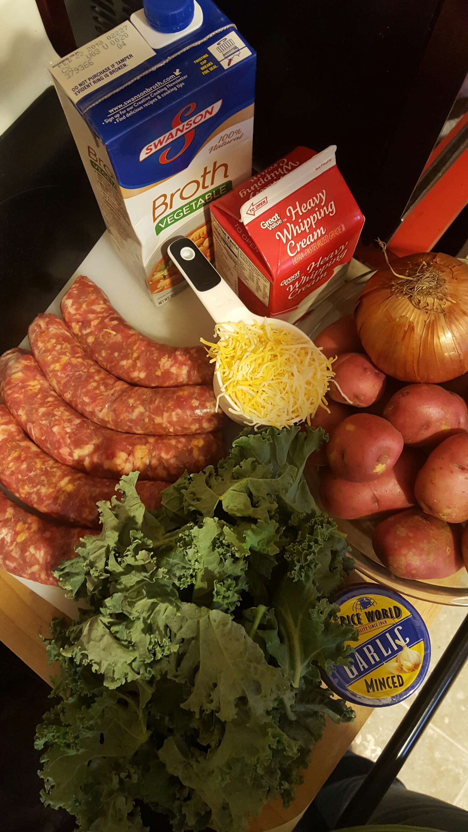 While sausage is browning, in a large stock pot, heat olive oil, add onions and garlic. Cook until translucent. Add broth, water, bay leaves, potatoes, salt and pepper. Stir together and bring to a boil. Reduce heat and simmer until potatoes are fork tender. Add sausage and kale, simmer for 5 minutes. Turn heat to low and stir in cream. Heat for 3 minutes, DO NOT BOIL. Cream will curdle if boiled. You just want to heat the cream. Turn off heat and ladle into bowls. I sprinkled cheese over top of soup after ladling into bowls but I found it was good without it too. Serve and Enjoy!